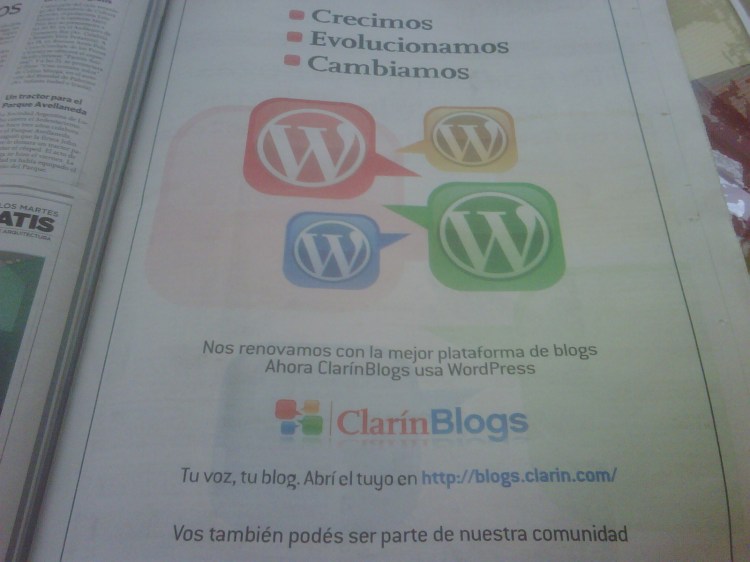 Clarin blogs ad Posted byMattJanuary 18, 2010January 18, 2010Posted inMoblog Hat tip: Mariano Amartino. Share: Click to share on Facebook (Opens in new window) Facebook Click to share on X (Opens in new window) X Click to share on LinkedIn (Opens in new window) LinkedIn Like Loading... Related Published by Matt In 2002 I started contributing to Open Source software, and life has just gotten better from there. Co-founder of WordPress, founder Automattic. View more posts