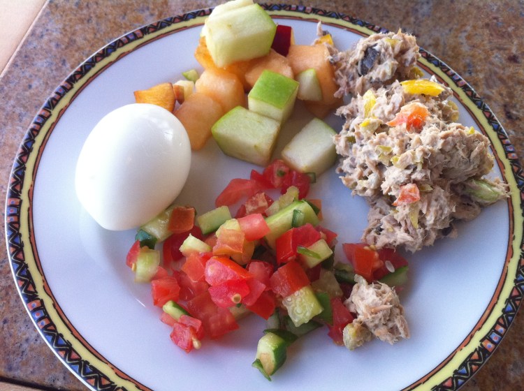 6 thoughts on “Round 2: hard boiled egg, fruit salad, Israeli sald, tuna salad”