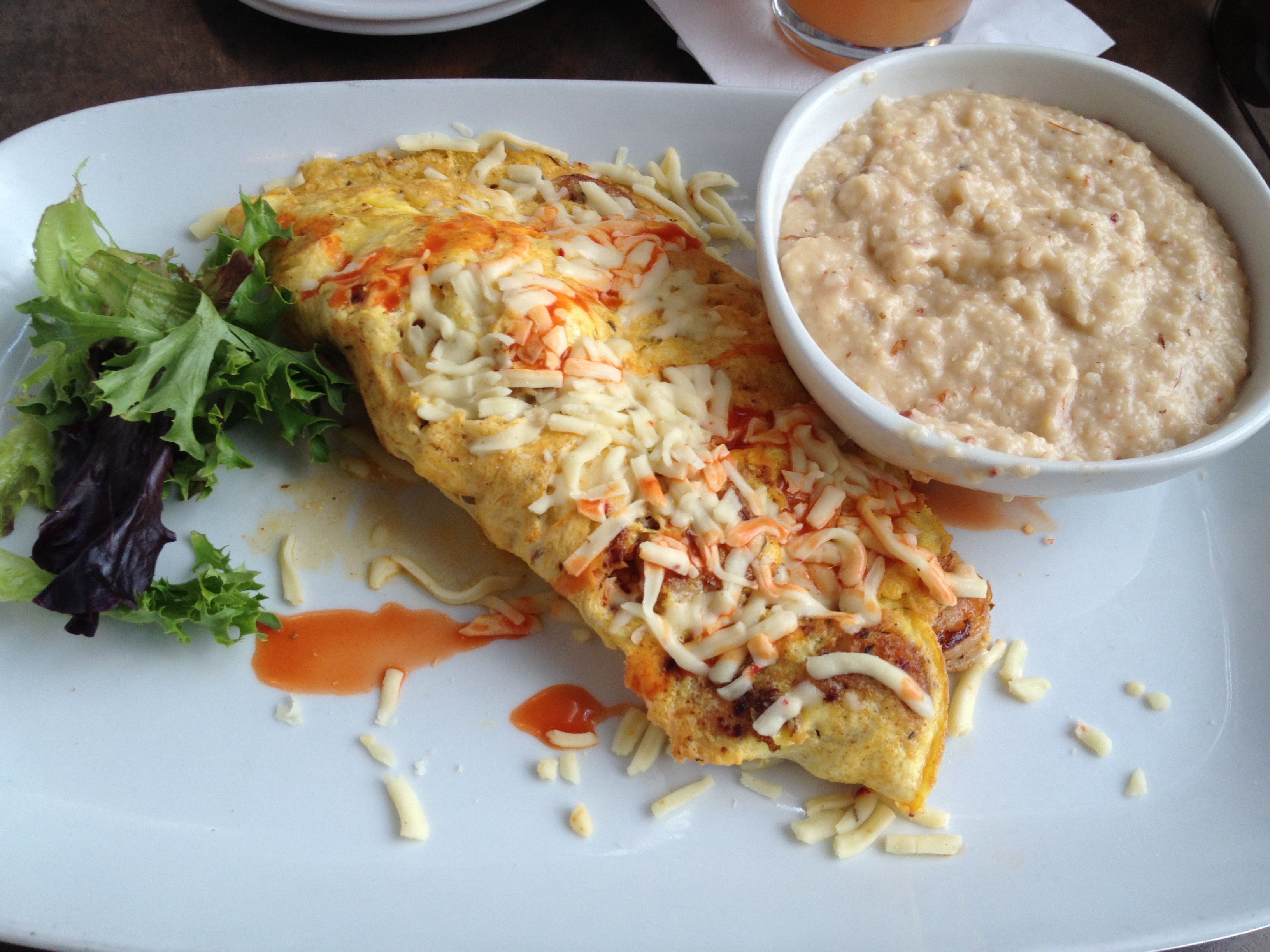 Blackened shrimp omelette and Cajun grits